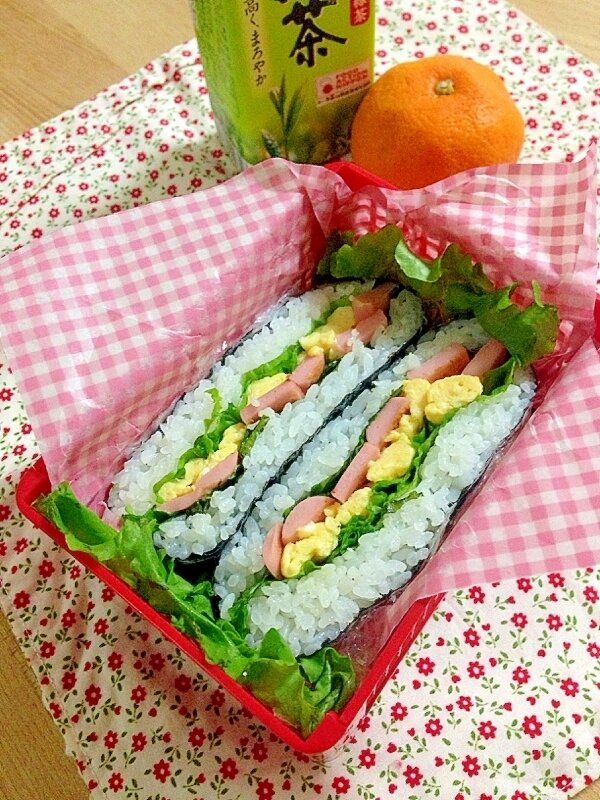魚肉ソーセージや卵などをはさんだ、おにぎらずレシピ。見栄えよくカットするために、具材の重ね方に注意し、切る方向には気を付けるようにしましょう。彩り豊かな一品です。