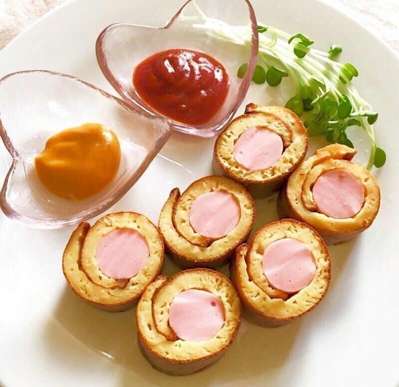 揚げないでつくる、ヘルシーなアメリカンドッグのレシピ。魚肉ソーセージに生地をくるくると巻いた見た目がかわいらしく、子どもも喜びそうですね。小腹が空いたときのおやつにぜひ!