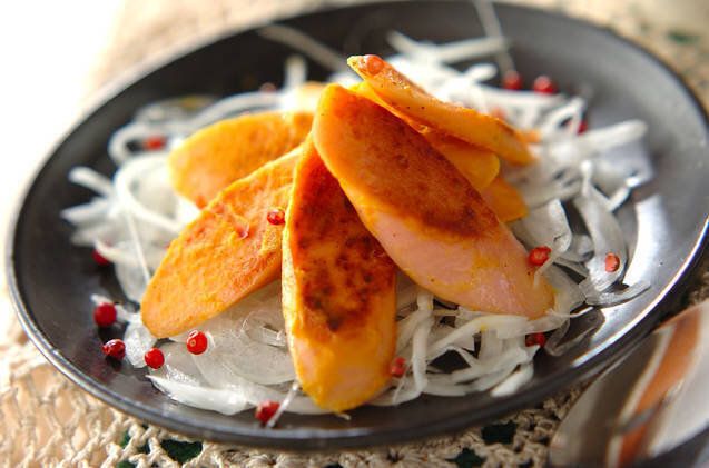 マスタードソースで味をつけた魚肉ソーセージのマスタード焼きのレシピです。ソースに白ワインをプラスしており、お酒のおつまみとしてもおすすめ。ピンクペッパーで彩りをプラスしています。