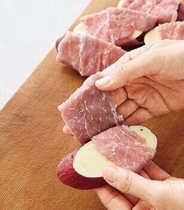 (1)さつまいもに豚肉を巻く