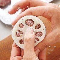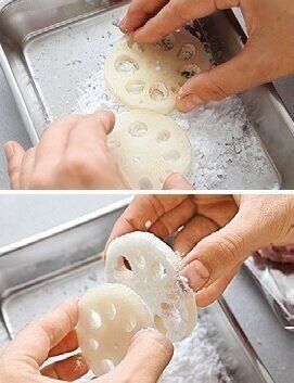 写真のようにして、れんこんの内側に薄く片栗粉をはたいておくと、肉だねがくっつく。
