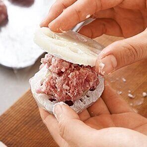 れんこんは皮をむいて、厚さ7~8mmに切り、24枚の輪切りをとる。さっと水にさらして水けを拭く。2枚1組にして内側になる面に片栗粉を薄くまぶす。(1)をはさみ(写真上)、上下をぐっと押さえ、側面に出た肉だねを指先で押さえて形を整える(写真下)。[A]は混ぜ合わせる。