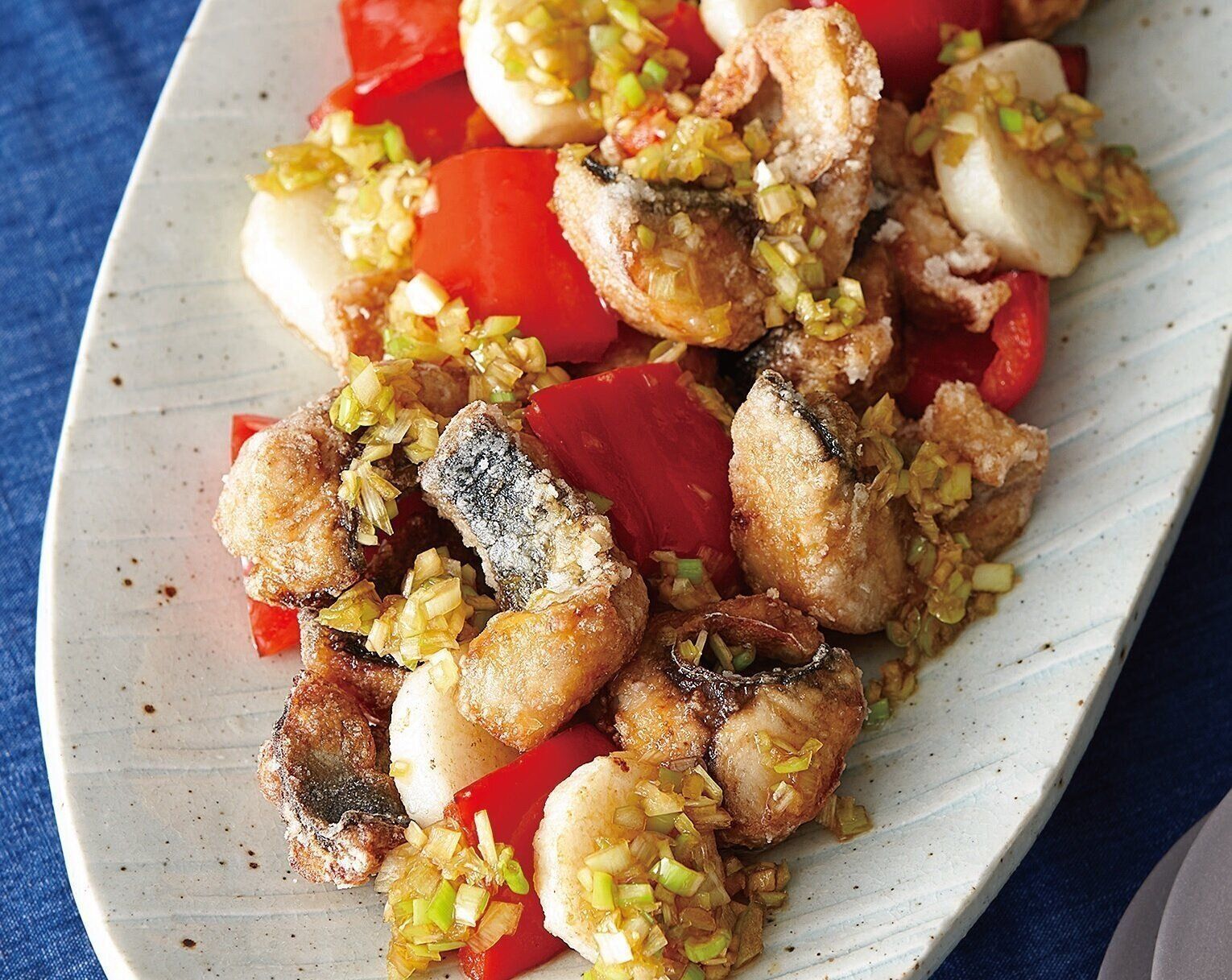 フライパンに揚げ油を深さ1cmほど入れて高温(180℃)に熱し、長いもは2分、パプリカは1分、さばは3分ほど時々返しながら揚げ、油をきる。器に盛り、ねぎソースをかける。