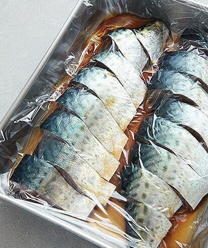さばの表面にぴったりとくっつけてラップをして漬けると、まんべんなく下味がしみ込む。