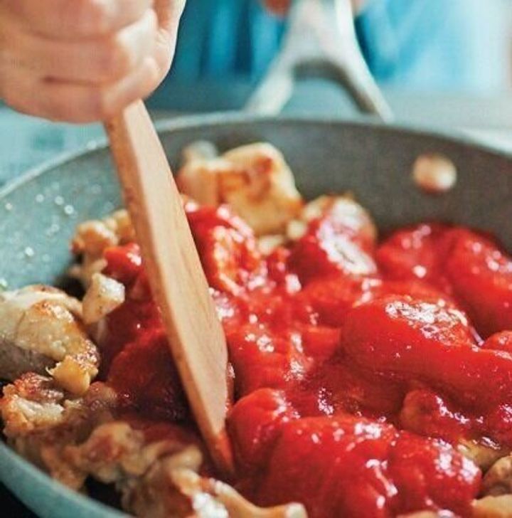 『サンキュ!』2020年12月号の「特売肉にはトマト缶」よりチキンのガリバタトマトソースをご紹介します。