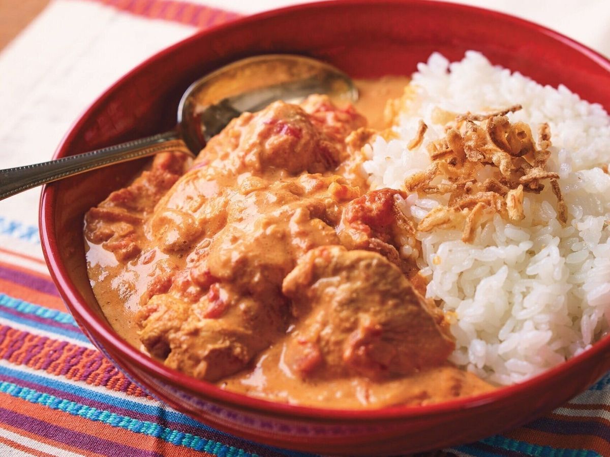 肉の表面が白くなってきたら、トマト缶、[B]を入れ、へらでトマトをつぶし、ふたをして弱火で10分ほど煮る。火を止め、バター、生クリームを加えて混ぜる。再度弱火で温め、塩、こしょうで味をととのえる。器にご飯を盛り、カレーをかけ、フライドオニオンをトッピングする。