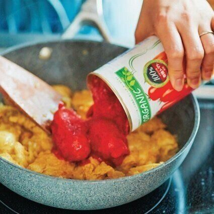 「鶏肉が焼けてきたらトマト缶を投入!」。