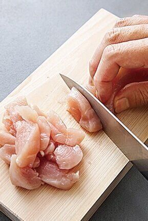 鶏肉は厚さ5mmほどの一口大のそぎ切りにし(写真)、塩、黒こしょう各少々をふる。ボウルに卵を溶きほぐし、チーズをちぎって入れる。