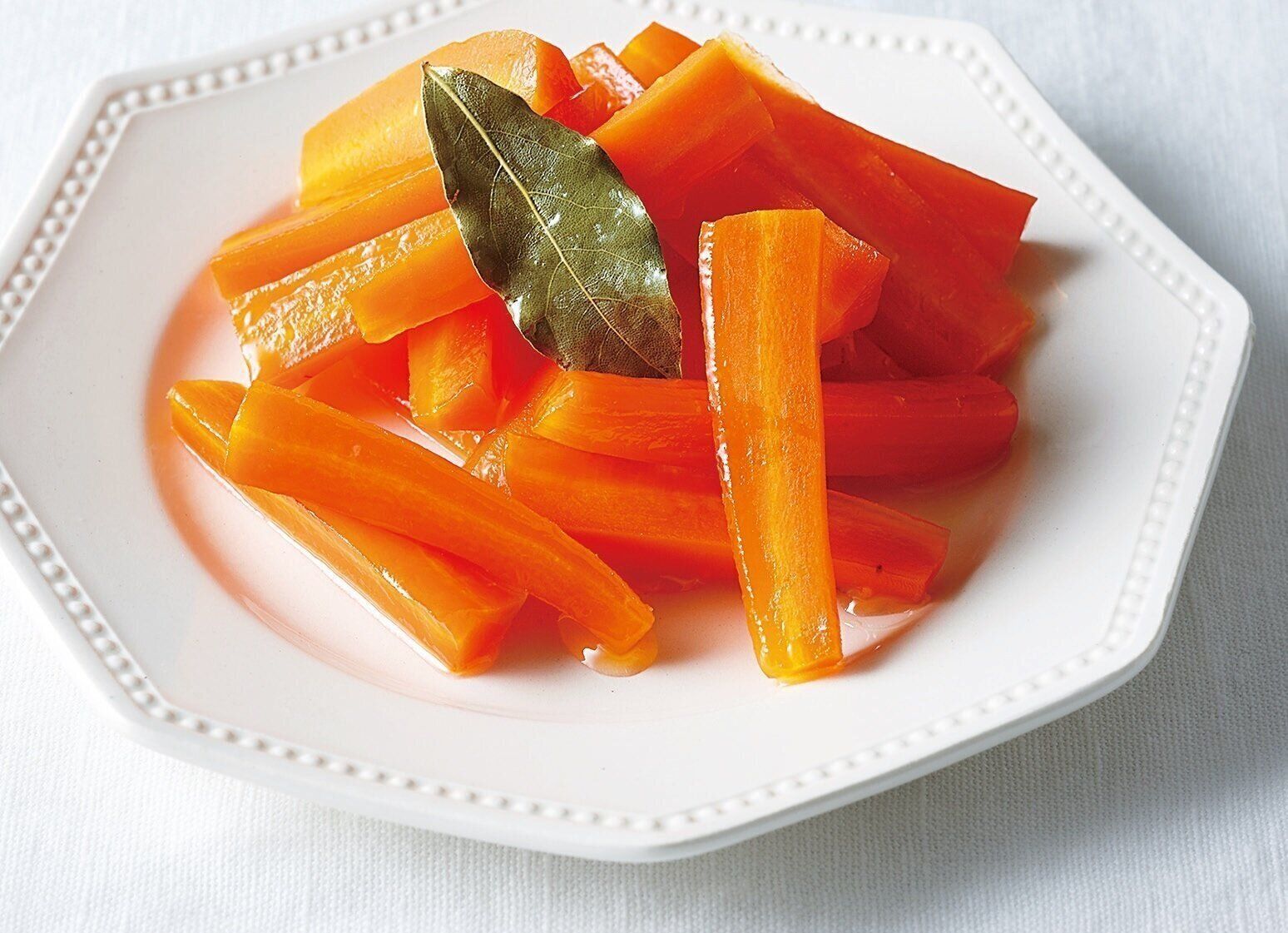 にんじんは皮をむいて長さ4cm、太さ1cmほどの棒状に切る。フライパン(または鍋)にバターを弱火で熱してにんじんを入れ、砂糖、酒、ローリエを加えてふたをして、柔らかくなるまでごく弱火で10~15分蒸し煮にする。塩少々で味をととのえ、レモンの絞り汁をふる。