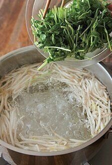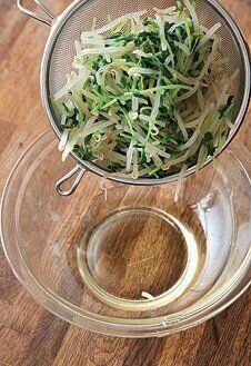 豆苗は根元を切り、長さを半分に切る。鍋に湯を沸かし、塩少々を入れ、もやしを入れて混ぜ、煮立ってきたら1分ほどゆでる。豆苗を加えて再び煮立ってきたら、ざるに上げて水にとって冷まし、水けをきる。