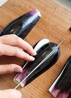 なすは縦に6等分に切ってフライパンに入れる。赤パプリカは縦に細切りにし、なすの上にのせる。