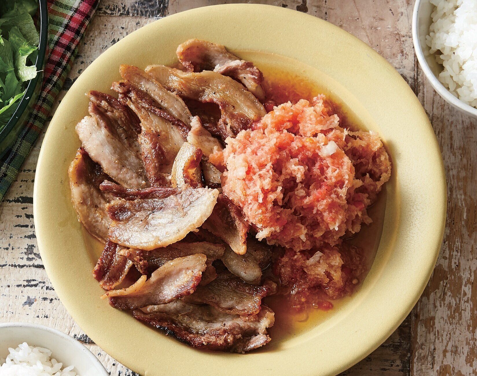 『サンキュ!』2021年1月号の「20分でささっと2品」よりカリカリ豚のトマトおろしのせをご紹介します。