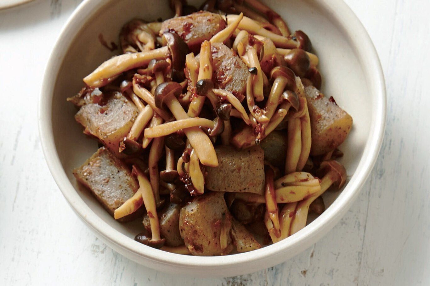 『サンキュ!』2021年1月号の「20分でささっと2品」よりこんにゃくとしめじの甘辛煮をご紹介します。