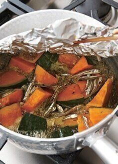 鍋に、かぼちゃ、食べる煮干し、水200ml、しょうゆ、みりん、砂糖を入れて中火にかける。煮立ってきたら、落としぶたをして6~7分弱火で煮る。