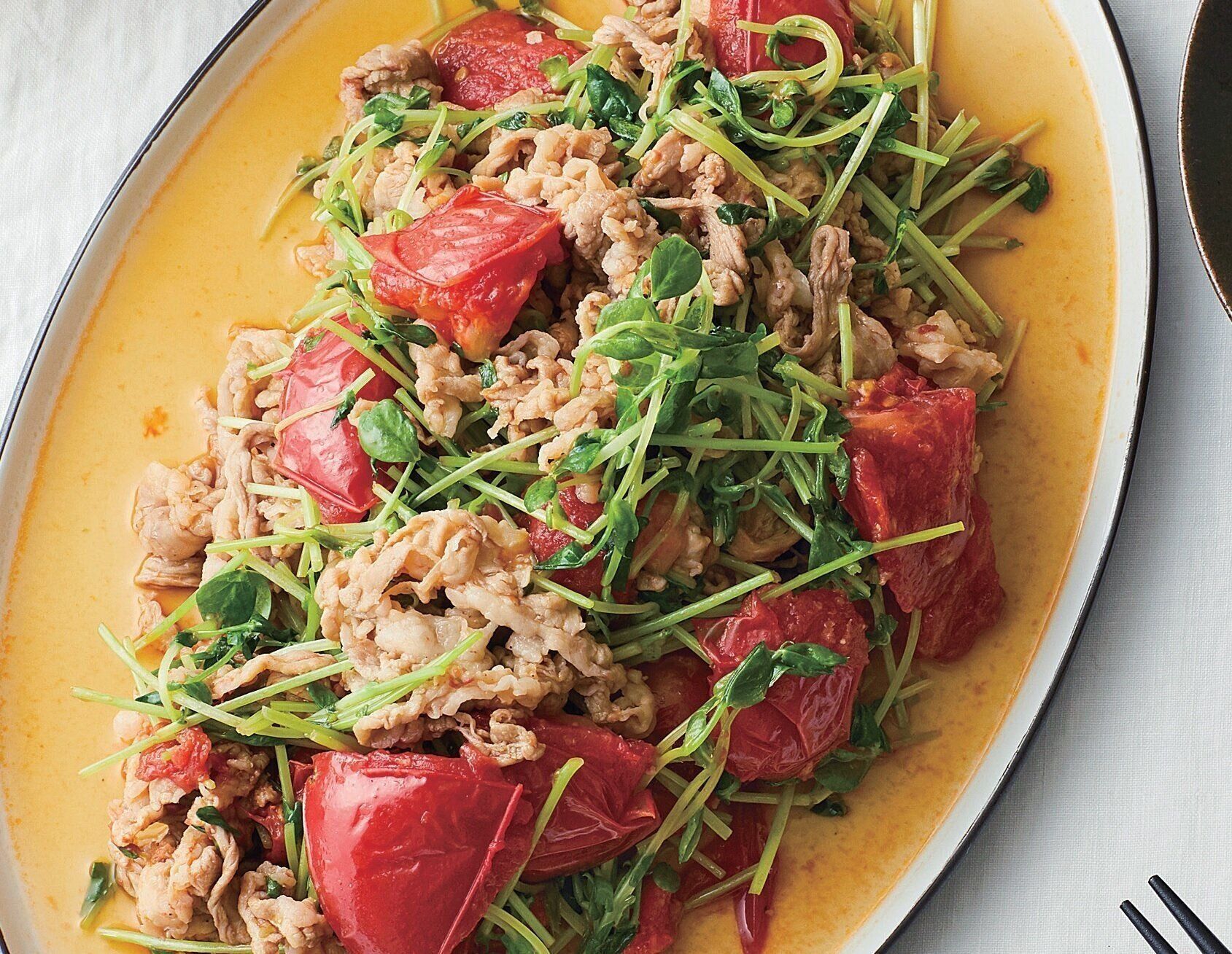 『サンキュ!』2021年1月号の「20分でささっと2品」より豚しゃぶ肉と豆苗のトマトしょうが炒めをご紹介します。
