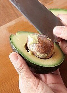 アボカドは縦半分に切って種を除いて、器に盛る。