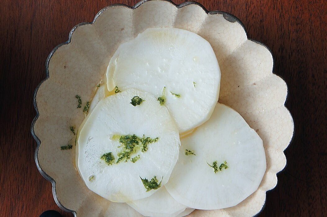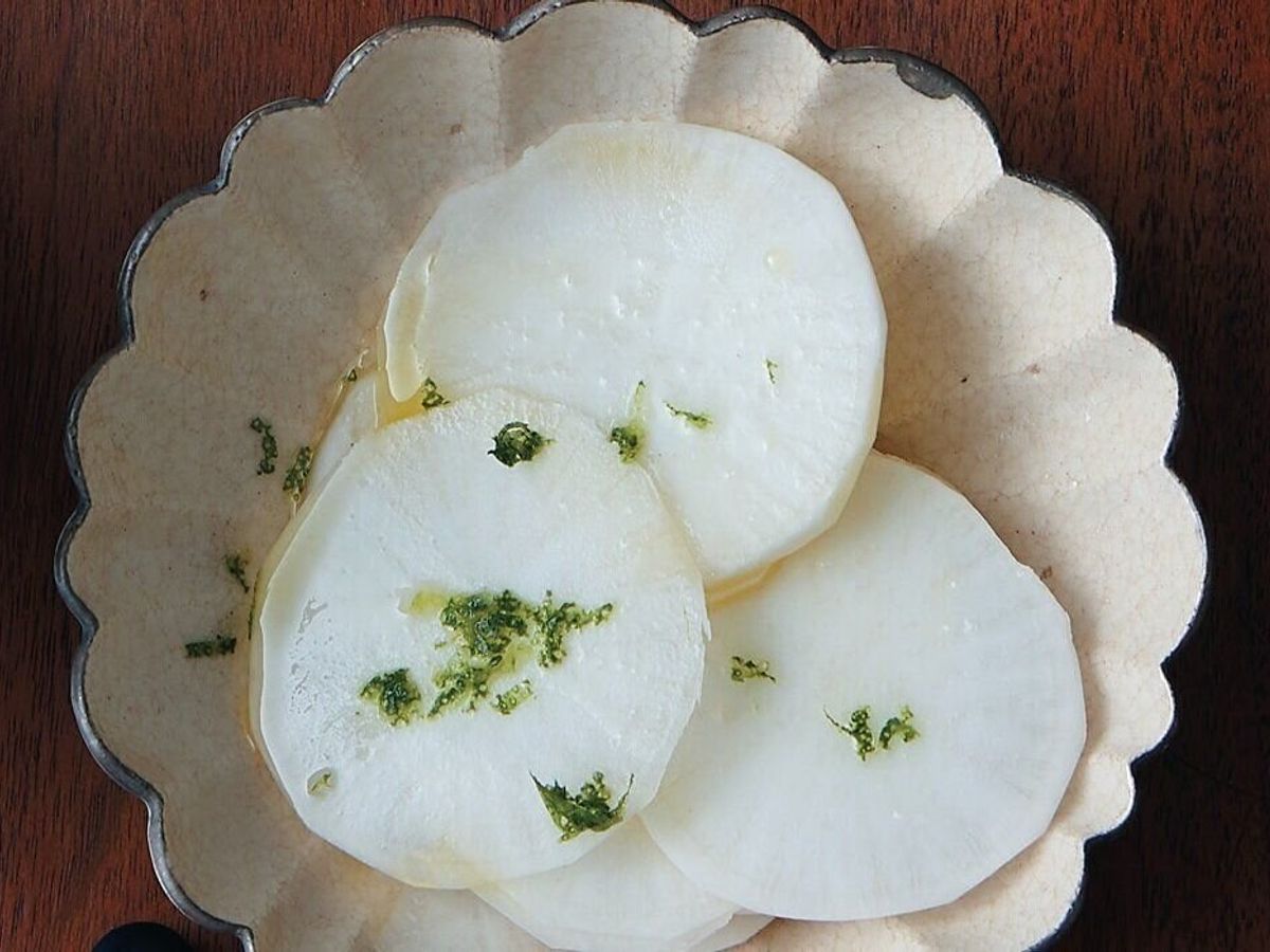 器にかぶを盛って、しょうゆ、オリーブ油をかけ、すだちを絞る。すだちの皮をすりおろして散らす。