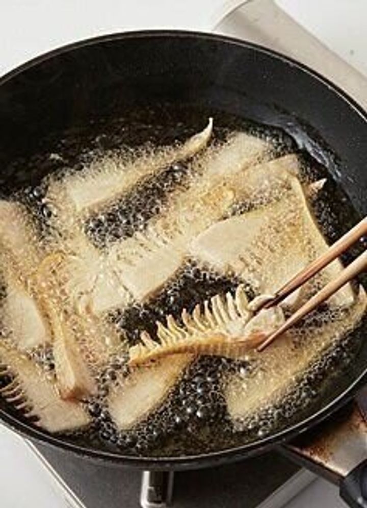 たけのこを厚さ1cmくらいに放射状に切り、ペーパータオルで水けを拭く。フライパンにサラダ油を深さ1cmくらい入れて中火で熱し、たけのこを入れて2分揚げ焼きにし、返してさらに2分、薄いきつね色になるまで揚げ焼きにする。