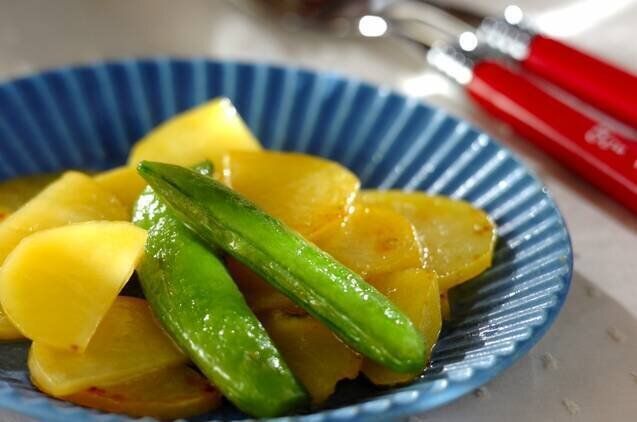 食感も楽しめそうな、スナップエンドウとじゃがいものはちみつバター炒め。はちみつとバターのコク&うま味で、パクパク食べられそうですね。お子さまにも喜ばれそうな一品です。