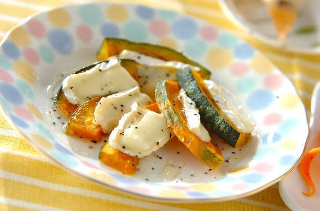 カボチャとカマンベールチーズの甘みと塩気が特徴の、カボチャのハニーチーズ。電子レンジで約10分で完成する手軽さで、洋食の副菜やおつまみにおすすめですよ。