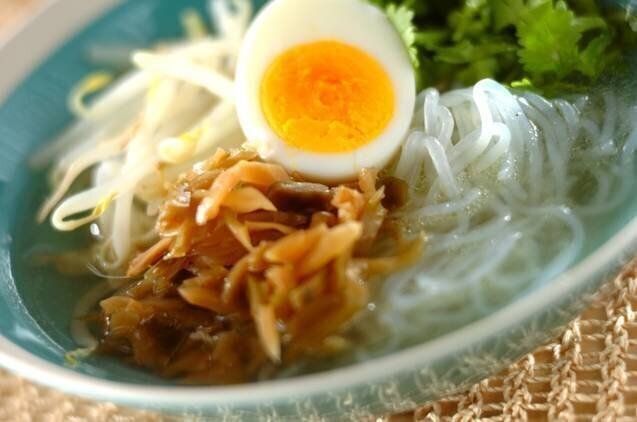 クセのないしらたきは、エスニック料理にもマッチします。こちらは、ナンプラーやパクチーを使った、アジアンテイストなスープ。パクチーのさわやかな香りに、いろいろな食感が相まって、クセになるおいしさの一品です。