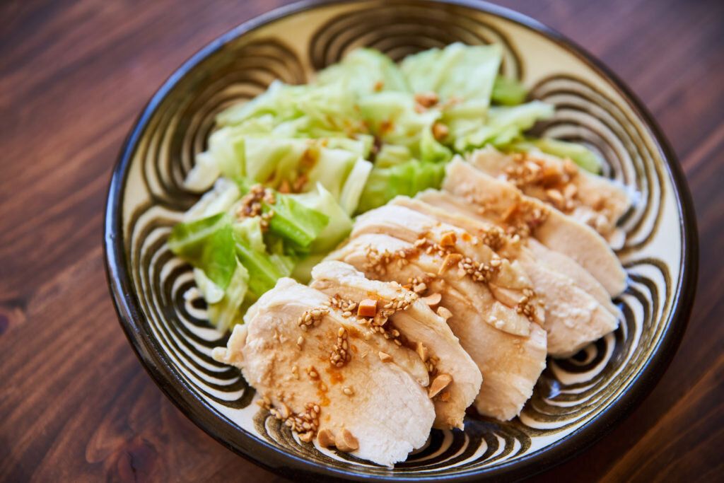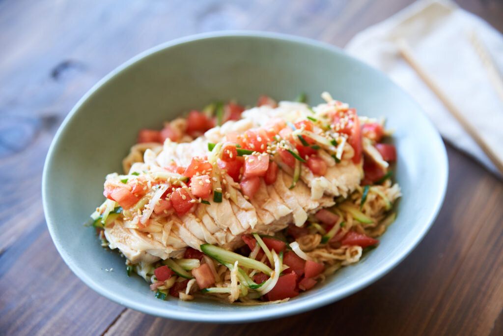 電子レンジで簡単につくれる蒸し鶏は塩麹に漬け込むことでしっとりやわらかくなります。野菜もたんぱくもしっかりとれ、火を使わずにつくれるのでいそがしいときにもササッとつくれて便利です。