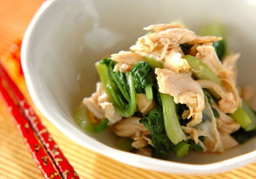 タンパク質が豊富な鶏ささ身と、チンゲンサイを使ったナムル。レモン汁も加えて、さっぱりと食べられそうですね。チンゲンサイは、ゆでる順番を間違えないようにするのが美味しくつくるコツです。