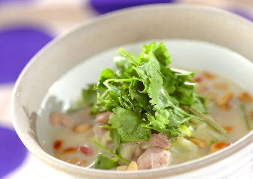 人気韓国料理のひとつ、サムゲタン風のスープご飯です。鶏肉を小さく切って使うことで、調理時間の短縮に!豆乳を加えたやさしい味付けで、夏バテ防止にもなりそうな一品です。