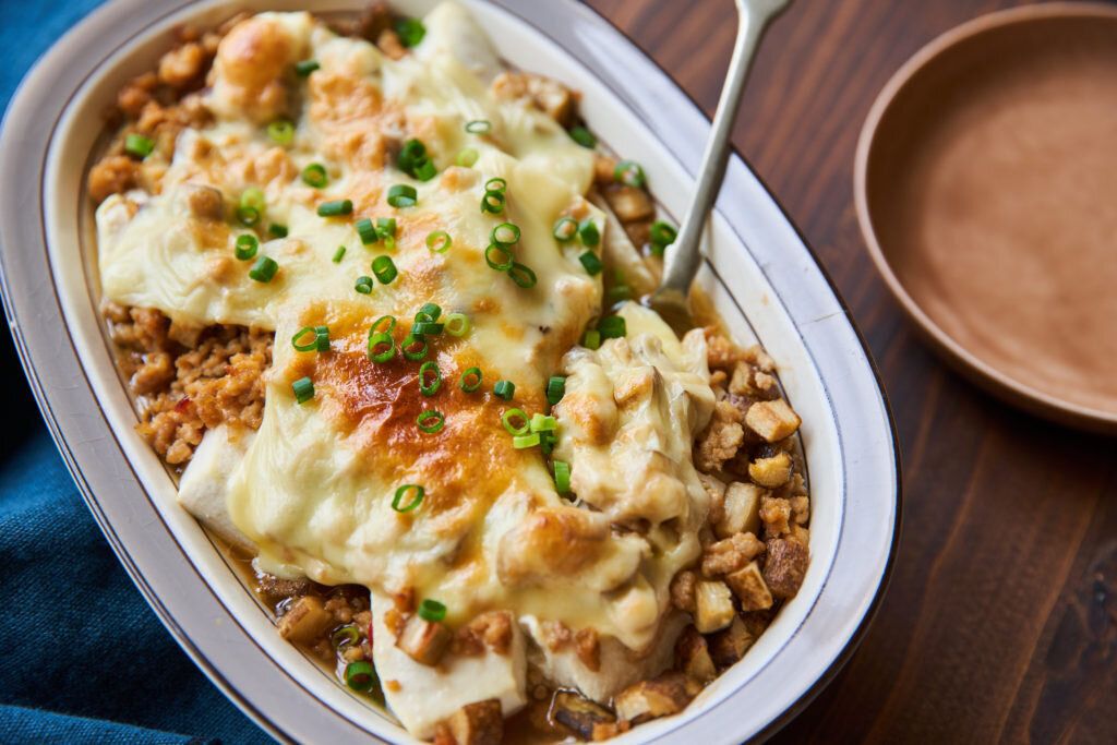 糖質控えめ&ヘルシーでうれしい、お豆腐のチーズグラタン。鶏ひき肉のそぼろなので、さっぱり食べられそうです。絹ごし豆腐やごぼうの食感を楽しむのもよいですね。