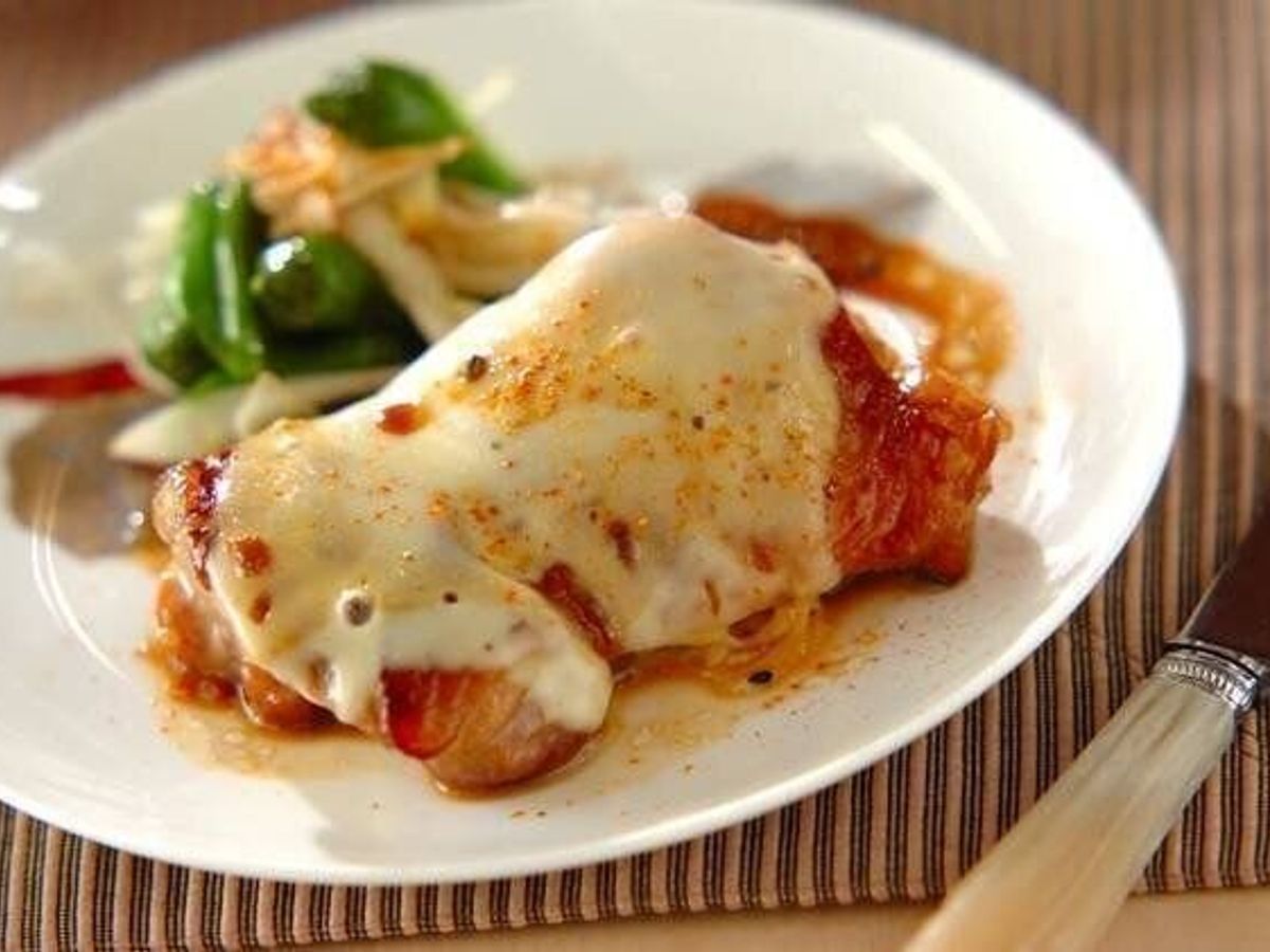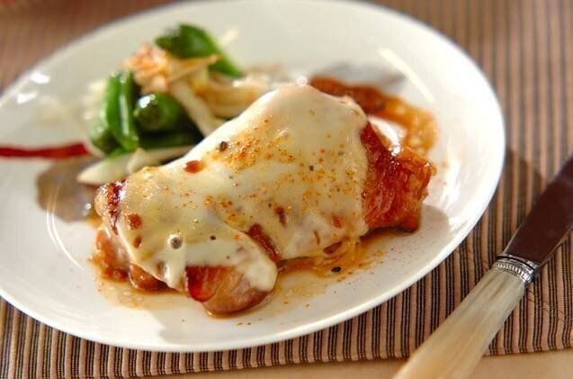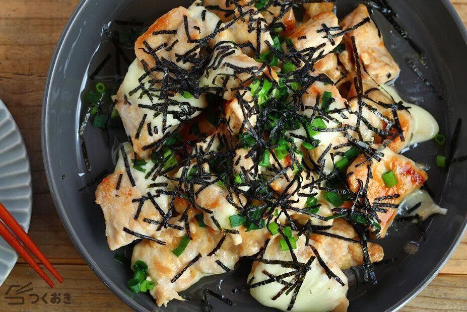 やわらかくジューシーな鶏もも肉の照り焼きに、チーズをのせた一品。コク深い甘辛ダレと、チーズの塩気がたまりません。シシトウや七味唐辛子などを添えれば、彩りもバッチリですね。