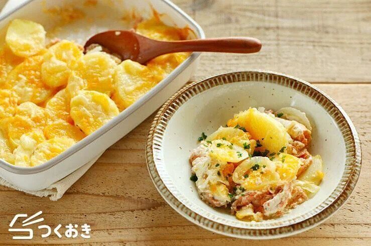 鮭とじゃがいもをメインの具材に選び、チーズをたっぷりトッピングしたグラタン。カットした食材と調味料を合わせたら、あとはオーブンにお任せという手軽さもいいですね。お弁当のおかずに入れても、喜ばれること間違いなし!