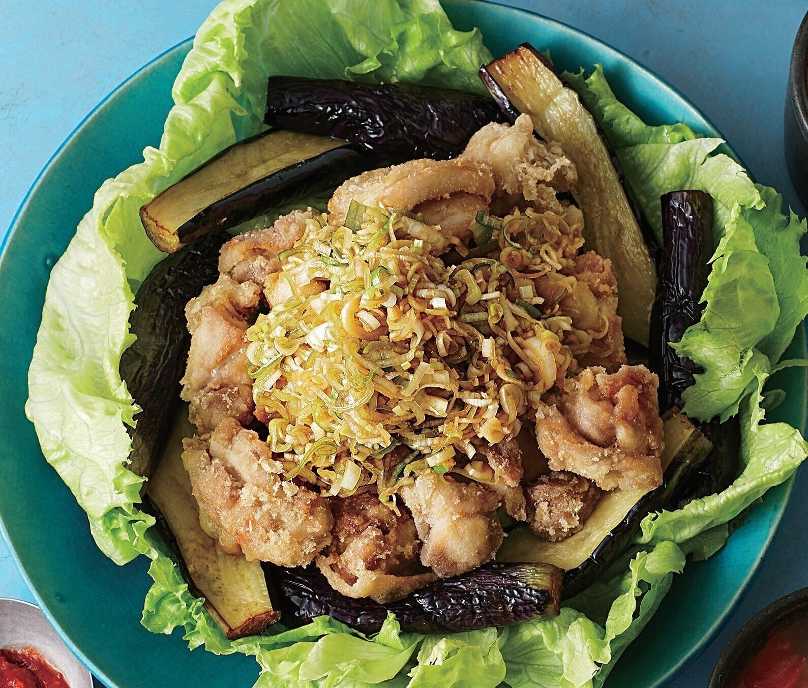 (1)のねぎを入れたボウルに、ねぎソースの調味料を加えて混ぜる。器にレタスを敷き、なす、鶏肉を盛り、ねぎソースをかける。好みで豆板醤を添える。