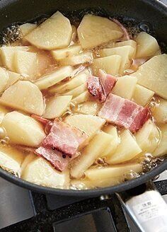 小さめのフライパンか小鍋にサラダ油を中火で熱し、じゃがいも、ベーコンを入れてさっと炒める。油が回ったら[A]を加えて強火にし、煮立ったら汁けが少なくなるまで中火で煮る。