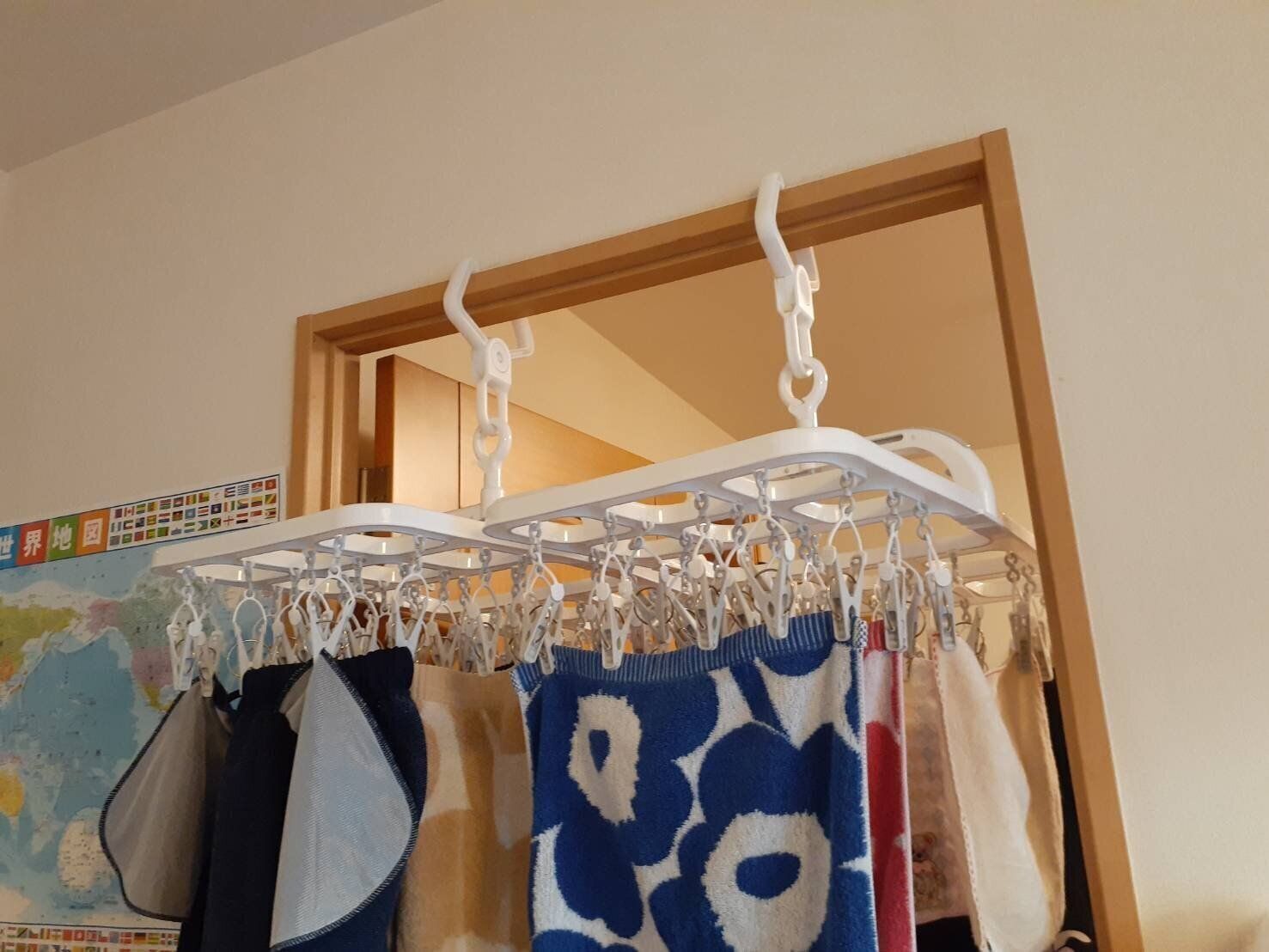 夜洗濯の場合、特に冬場は部屋干しするのが一般的だと思いますが、ポイントは家の中の風通しのいい場所に干すこと。ついカーテンレールなどにかけがちですが、窓やドアの位置、エアコンの風向きなどを考え、家の中で一番風通しのいい場所を見極めて干すようにしましょう。ちなみにわが家では、風の通り道になる家の中央に、100円ショップのハンガーキャッチを鴨居やドアの枠部分に取り付けて干しています。