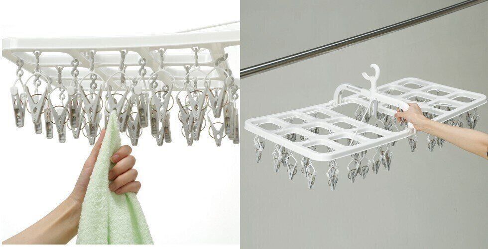 洗濯物を下に引っ張るとピンチが開く設計で、生地を傷めずに簡単かつスピーディ―に取り込むことが可能。60個のピンチでたくさんの洗濯物をまとめて干すことができ、丈夫なフレーム設計なので重量があるアイテムでも安心。部屋干しに便利なスライドフックを採用し、ドアや鴨居にかけられるのも便利。40ピンチや24ピンチタイプもあり。