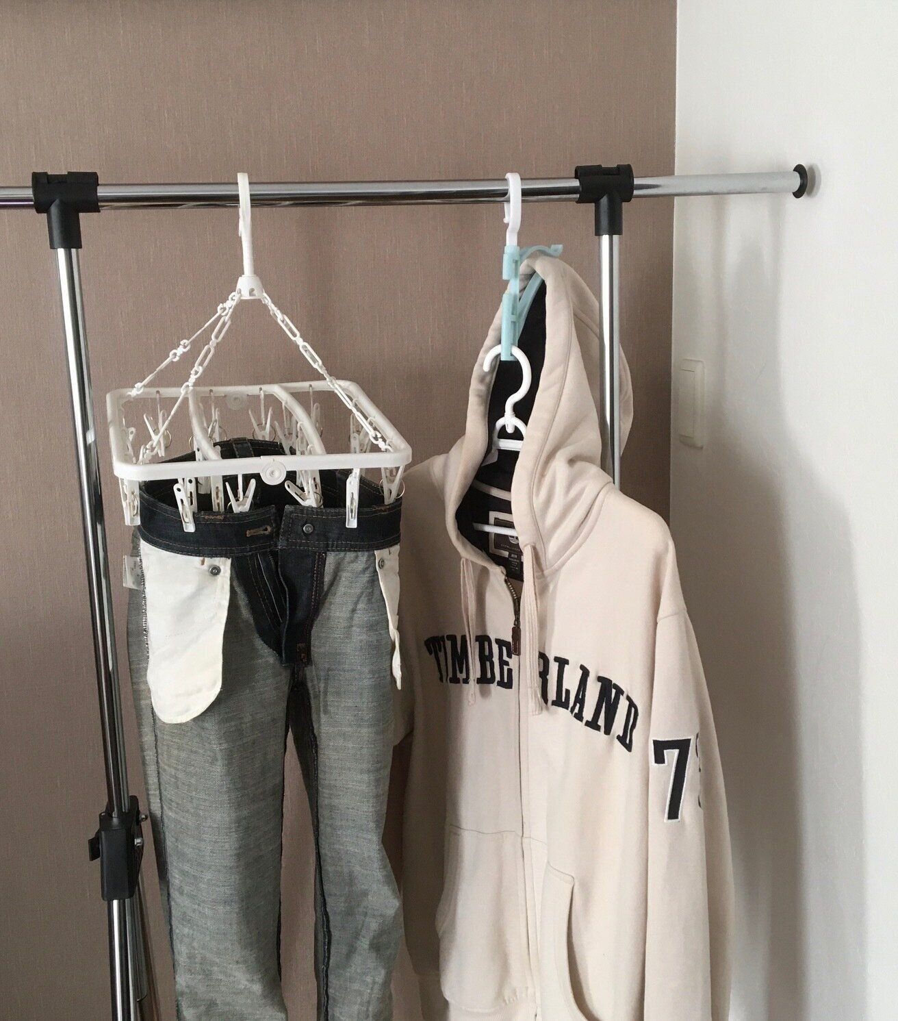 厚手のトップスは厚みのあるハンガーを使い、服の中に空間ができるように干しましょう。フード部分が乾きにくいパーカーは、100円グッズなどの専用ハンガ―を使ったり、ハンガーにつるしたパーカーのフード部分を物干し竿の端に引っかけるようにして干すと乾きやすくなります。