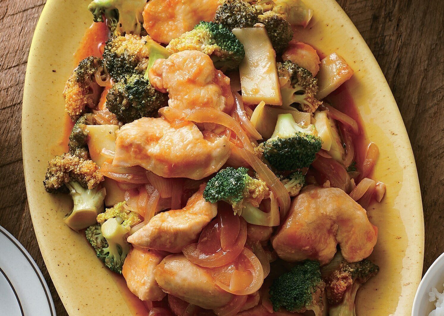 玉ねぎは縦半分に切って、縦に薄切りにする。ブロッコリーは小房に分け、茎は皮を厚めにむいて長さ4cmに切り、縦に薄切りにする。鶏肉はそぎ切りにし、薄力粉をまぶす。