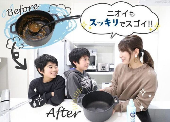 「カレーや魚料理に使ったあとのお鍋や容器って、何度か洗ったりつけ置きしたりしないとニオイがなかなか消えないことが多いけど、『消臭ジョイ』は一度洗っただけでニオイがしなくなってビックリ‼ しかも! 洗っている最中にまわりの空間のニオイまで消臭してくれているみたいで2度ビックリ。あまりのすごさに子どもたちも感動していました。