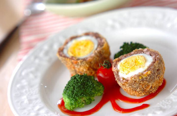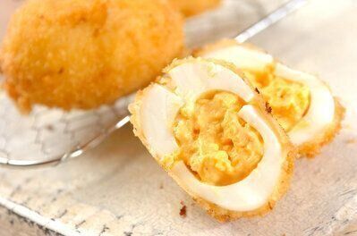 たまご一個を丸々揚げた豪快なアレンジレシピ。黄身はホワイトソースと混ぜることで、濃厚な味わいに仕上げています。