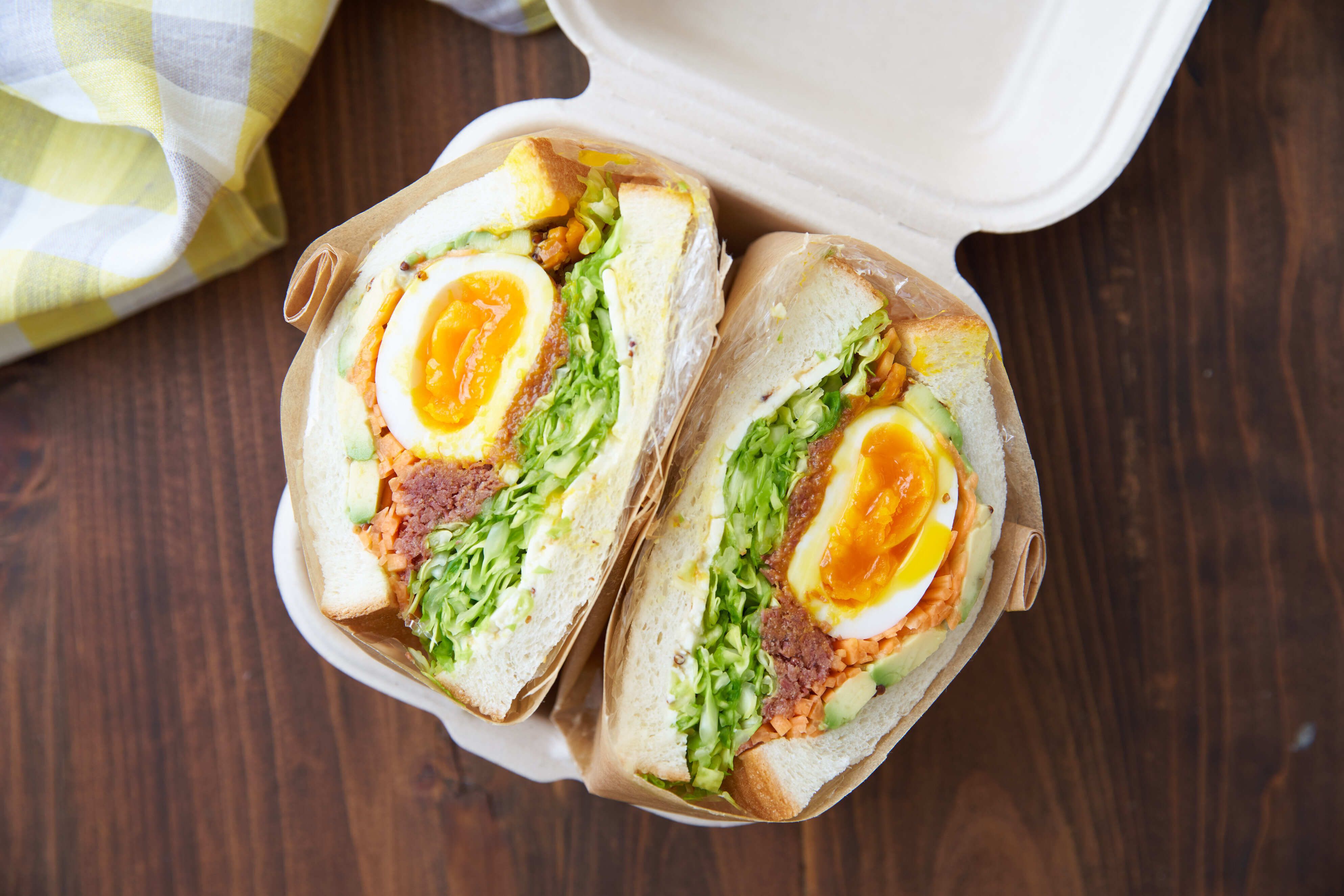 ゆで卵が丸ごと1個入った、ボリューミーなサンドイッチ。たっぷりの野菜とコンビーフもはさまっているので、食べ応えばっちりです。カラフルな断面で見栄えもいいので、ピクニックなどレジャーのお弁当にも最適です。