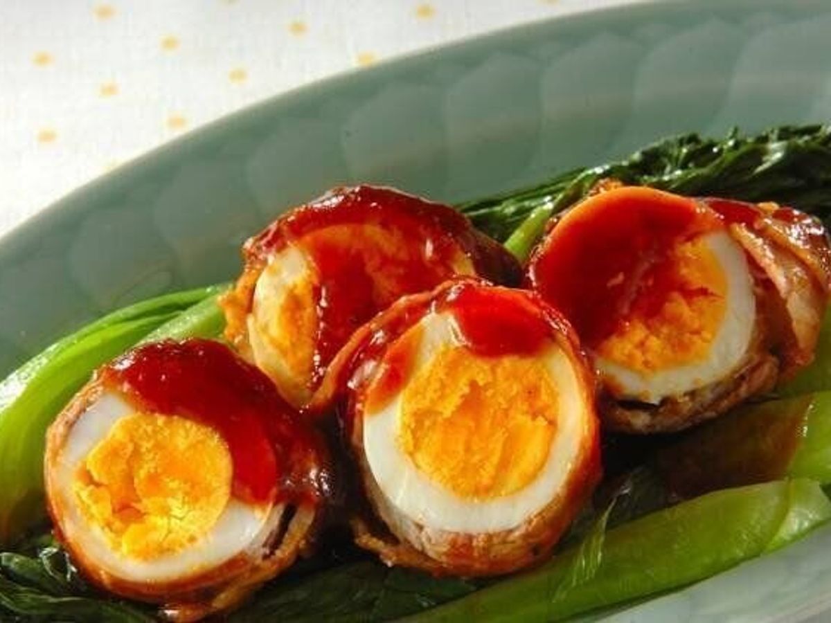 ゆで卵を豚バラ肉で包んで焼いた肉巻き卵は、コチュジャンとすりおろしニンニクが入った甘辛ソースがクセになる一品。豚バラ肉は少量でも食べ応え抜群!見た目が色鮮やかなので、お弁当やおもてなしにもおすすめ。