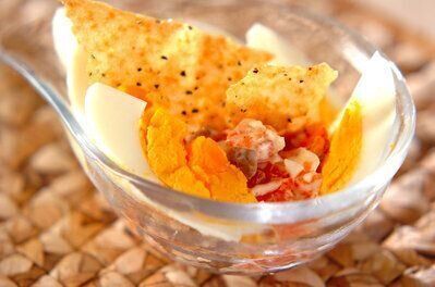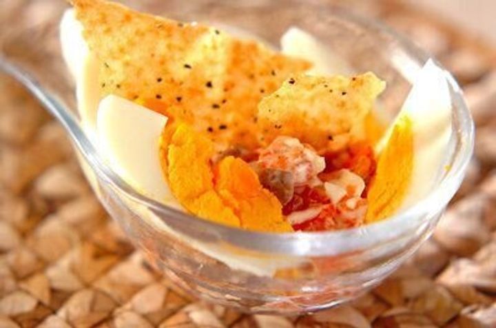 スモークサーモンとゆで卵を合わせたアレンジレシピ。スモークサーモンの香りとゆで卵がなんとも言えないおいしさ。お酒のお供にもぴったりです。