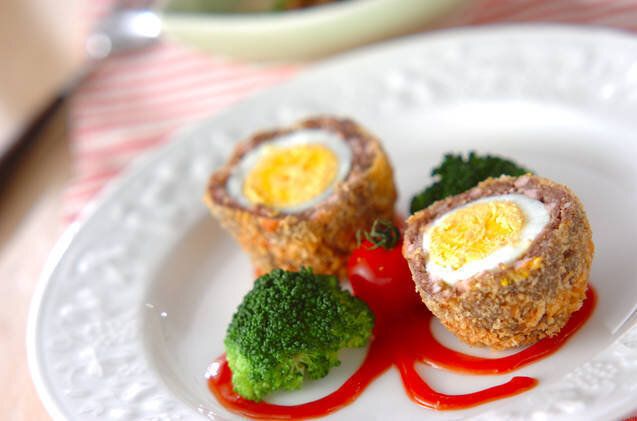 ゆで卵を肉だねで包んで揚げた、スコッチエッグのレシピ。肉だねは刻んだ魚肉ソーセージ入りで、食べ応え抜群!断面がキレイなので、おもてなしやお弁当にもおすすめです。