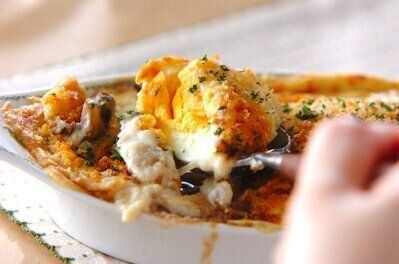 ゆで卵をグラタンの中に仕込んだアレンジレシピ。ゆで卵だけだと副菜になりがちですが、このレシピは食べ応え抜群!立派な主役になります。