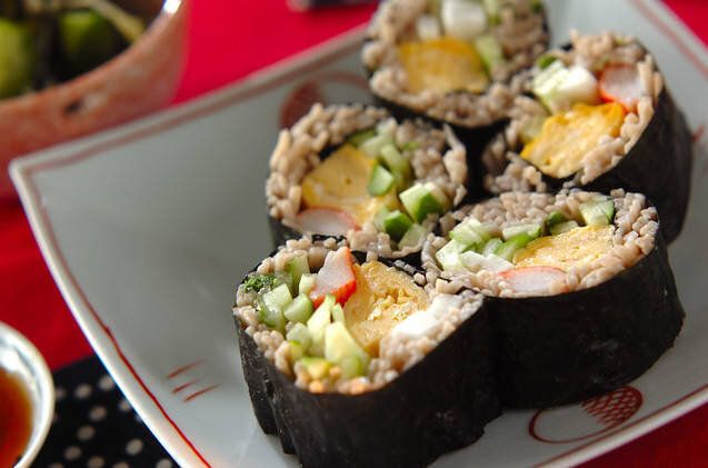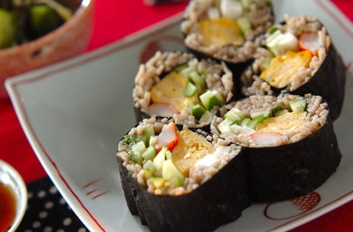 そばと具材をいっしょにくるくると巻いた、海苔巻きのレシピです。甘めの卵焼きやきゅうりなど、具だくさんで食べ応えがあります。そばを糸で結って、まとめてゆでるのがポイントです。