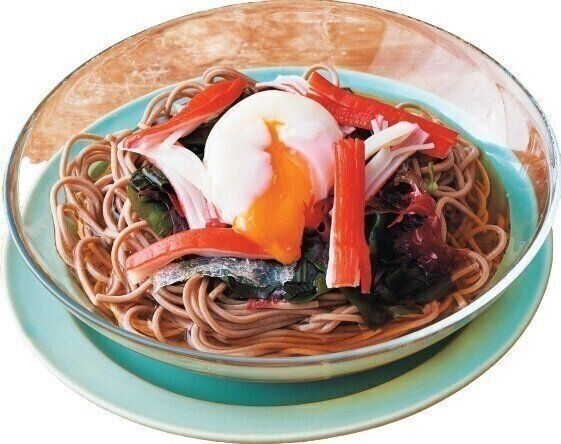 簡単サラダそばのレシピです。海藻ミックスとカニカマがあれば、そばに盛りつけるだけで立派な一皿が完成します。温泉卵を上にトッピングすれば、そばと絡んでつるっと食べられます。
