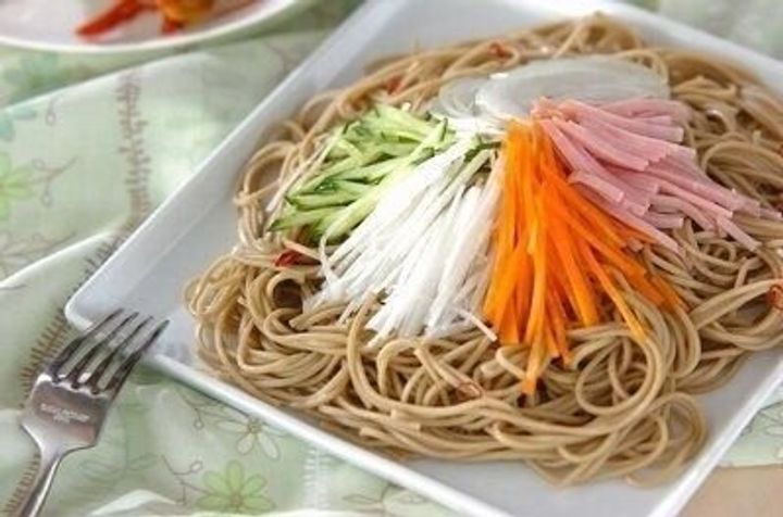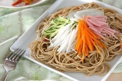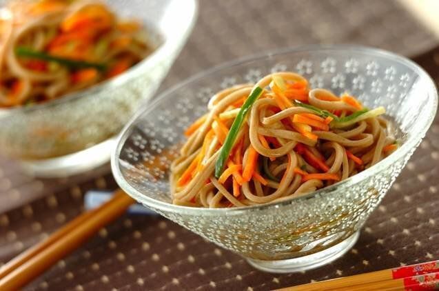 そばの和え物レシピ。甘辛の酢しょうゆが効いていて、さっぱりとした味わいです。千切りにしたキュウリとニンジンを混ぜあわせるだけなので、いそがしい日でもお手軽につくれます。