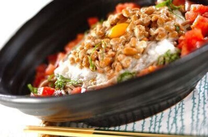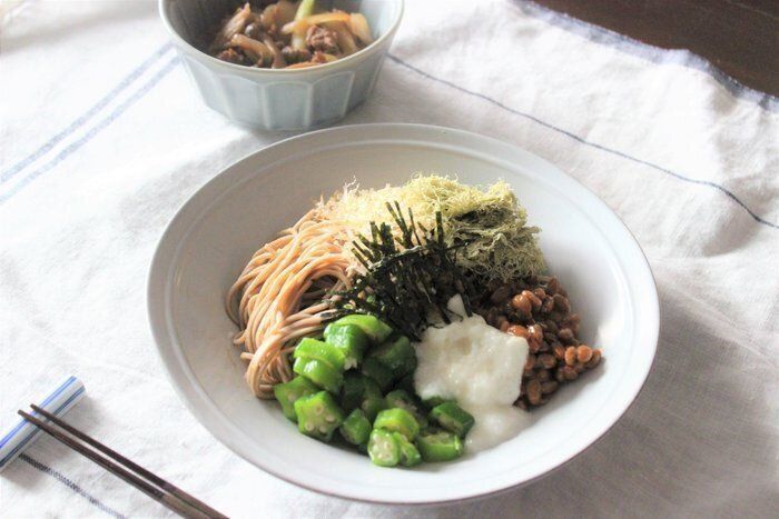 華やかな見た目のトロロ納豆そばのレシピ。ネバネバ食材同士なので、相性バツグン。大和芋の粘り気と納豆の旨味がそばとマッチして、クセになる一品です。つるっと喉越しよくいただけます。