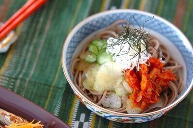 ピリッと辛いキムチがクセになるおいしさのこちらのレシピ。おそばをゆでたらあとは火を使わずにつくれるのでささっとご飯をつくりたいときにおすすめ。
