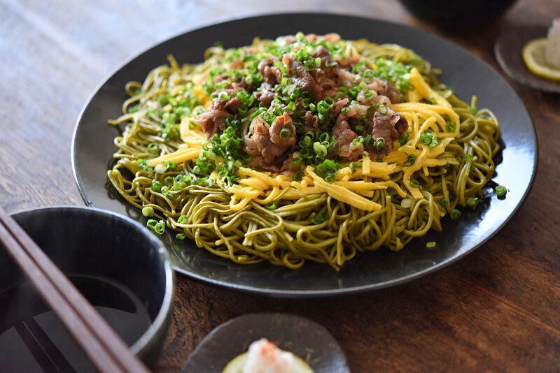 カリッと焼いた茶そばでつくる、山口県名物の瓦そば。炒めた牛肉や錦糸卵をのせていただきます。茶そばを使うことで、たくさんの具材との味のバランスを整えてくれて、あたたかいつゆがよくあいます。